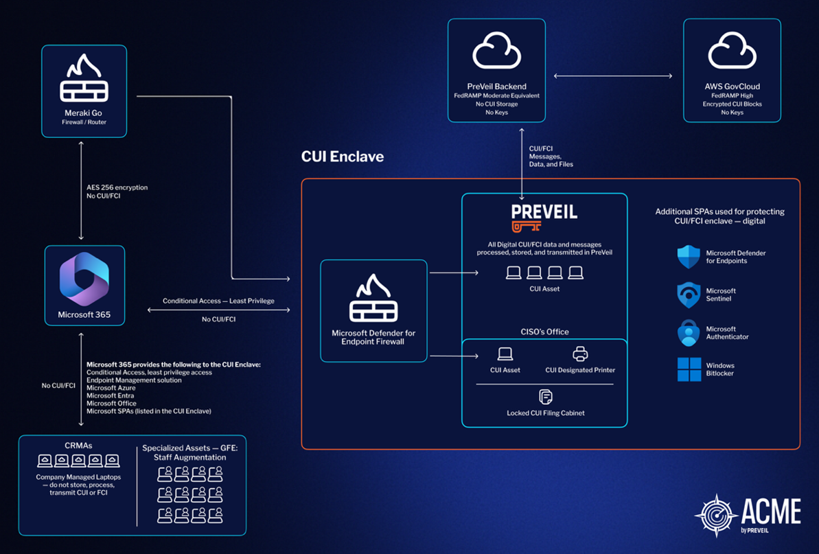 At the heart of Acme’s compliance architecture is PreVeil, which serves as the company’s secure enclave for all CUI files and secure emails. PreVeil is used exclusively for processing, storing, and transmitting CUI, satisfying key NIST 800-171 controls related to encryption, access control, and data transmission. PreVeil is deployed alongside a standard commercial Microsoft M365 tenant that handles non-CUI data.